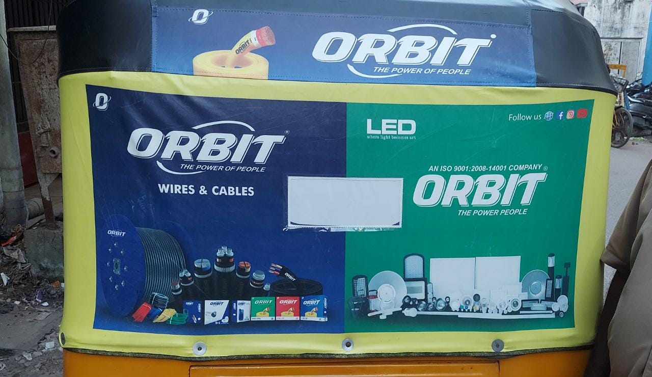Orbit wires and cables brand advertised behind auto rickshaw.