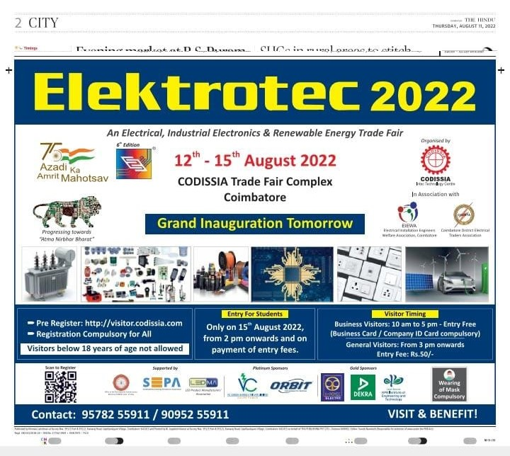 Orbit Wires and cables took part in the ELEKTROTEC 2022, which is an Industrial Electronics and Renewable energy Trade fair. It was held in Coimbatore from 12th Aug 2022 to 15th Aug 2022. The expo included top leading brands in India in par with Orbit wires and cables specializing in various industries.